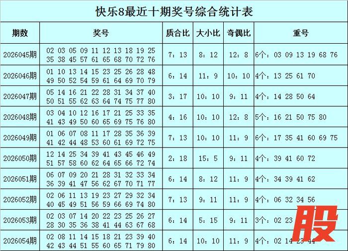 福彩快乐8第2026054期开出奖号:02 08 11 14 15 18 21 23 39 40 42 43 44 51 55 60 65 71 79 80,其中奖号质合比为6:14,四区比为6:4:6:4,包含4个重号02、14、23、44,包含连码14 15、39 40、42 43 44、79 80,包含7个邻号08 15 21 39 40 42 43。